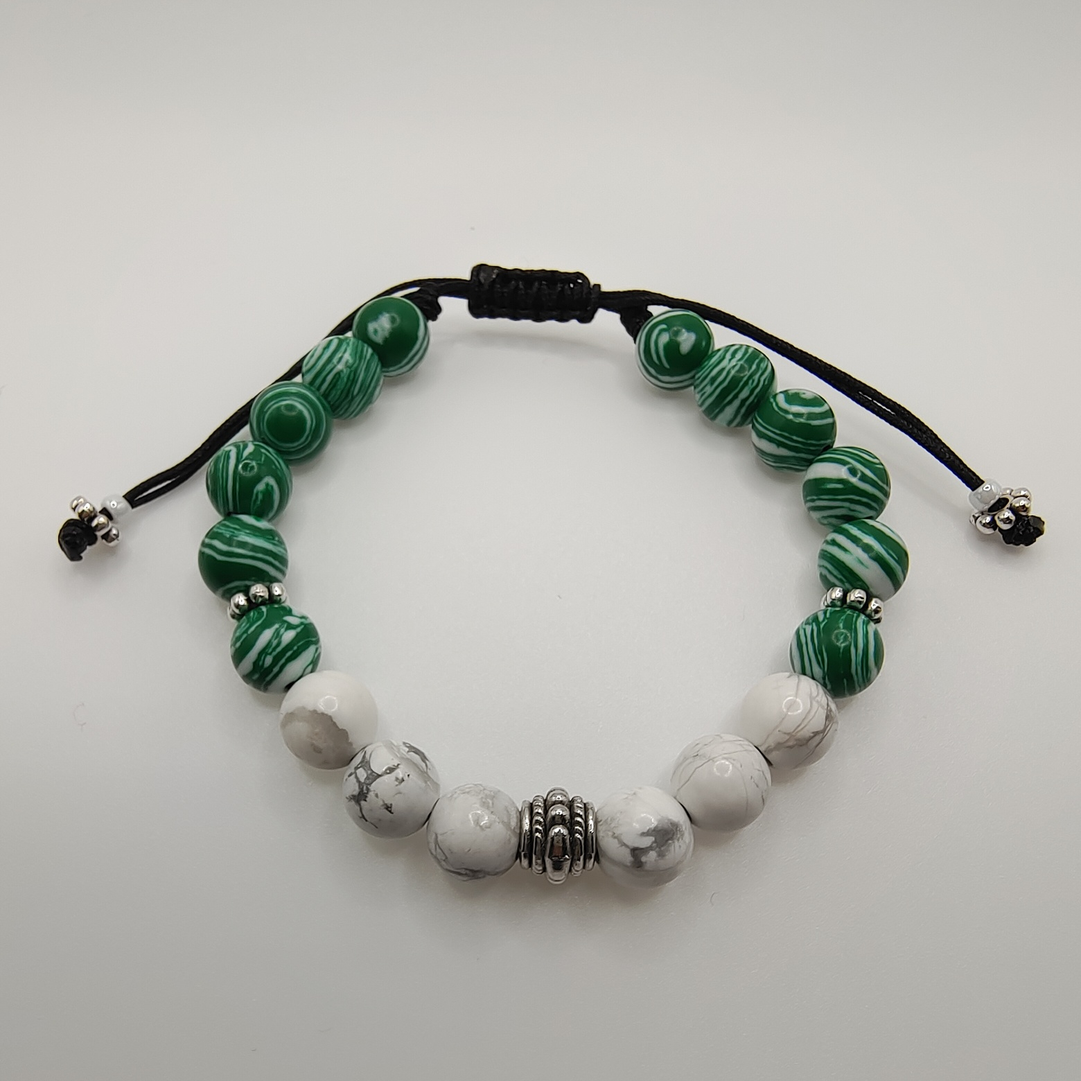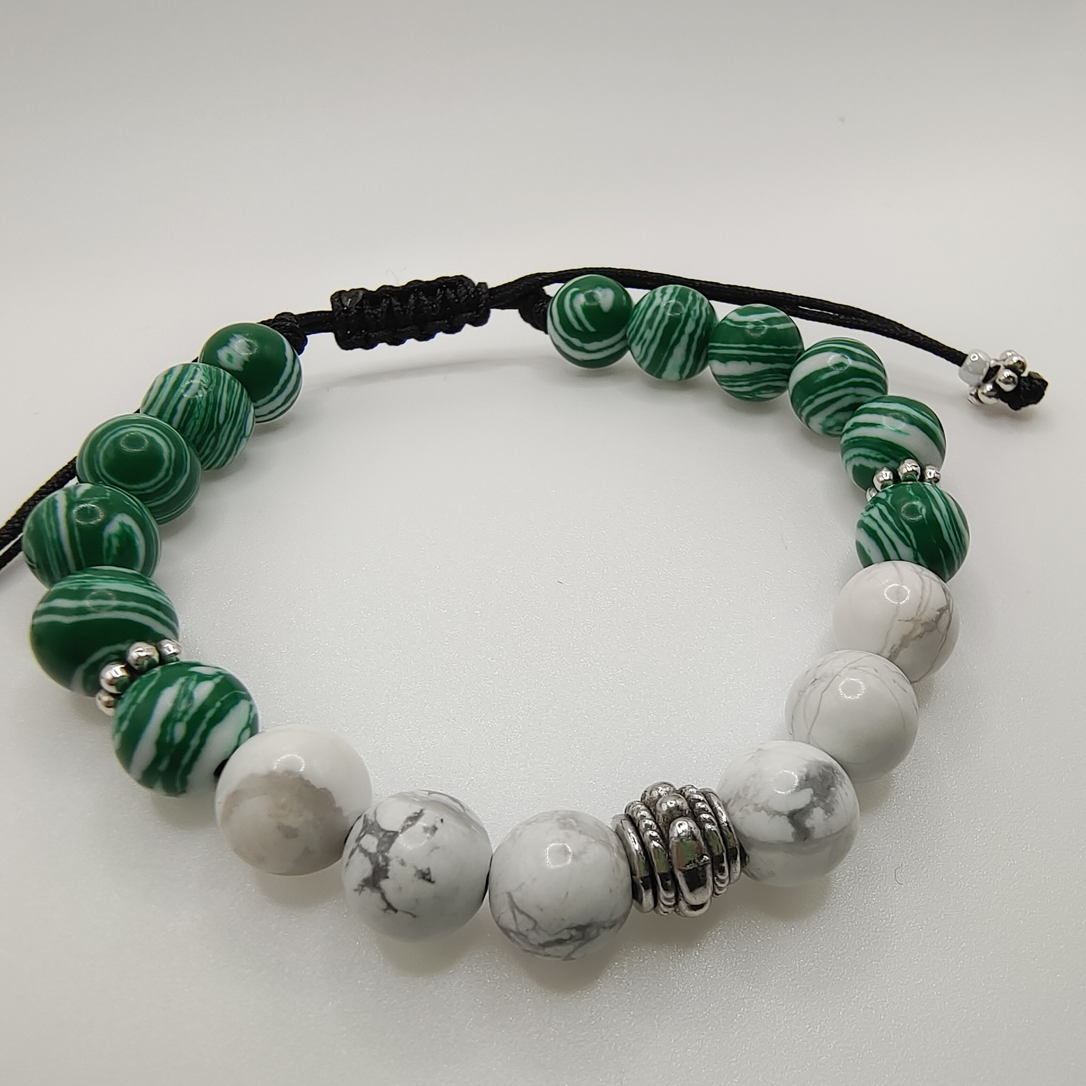 Brățară pe șnur din pietre semiprețioase Malachit și Howlit, cu accesorii argintate și antichizate – Un accesoriu elegant și rafinat, creat pentru cei care apreciază detaliile fine. Malachitul impresionează prin nuanțele sale vibrante de verde, iar Howlitul adaugă un contrast subtil și liniștitor. Accesoriile argintate și antichizate completează designul cu un aer sofisticat. Reglabilă și confortabilă, această brățară este perfectă pentru orice ocazie și stil.